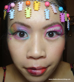 My right eye is based on Skittles and M&Ms. My left eye is based on those strawberries and cream twirly lollipops. My lips are like mixed berry candy. Pretty colourful huh?
